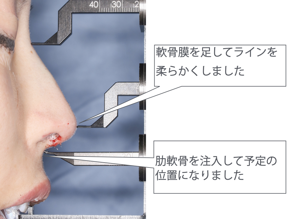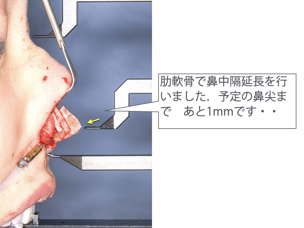 肋軟骨による鼻中隔延長を行い 鼻尖を約5mm前方に移動します.鼻尖は,軟骨の形態を調整して,スリムな輪廓を作成する予定としました.アプローチとして,腫れを軽減し,ナチュラルな鼻尖形態が得られる,ストラクチャー・プリザベーション法を選択します.