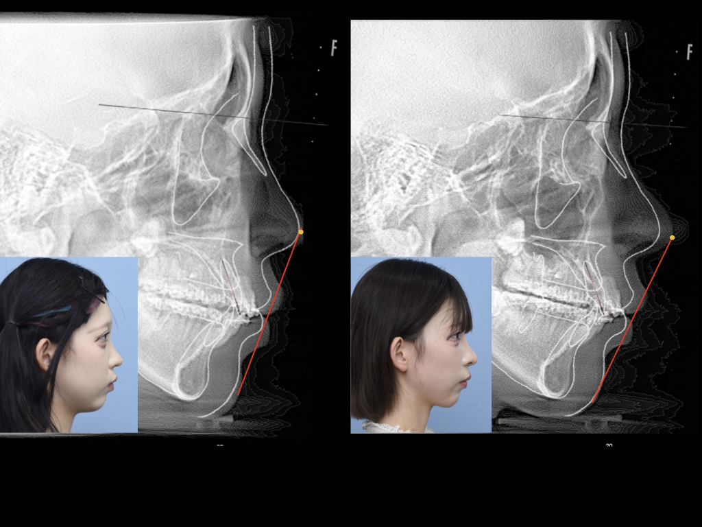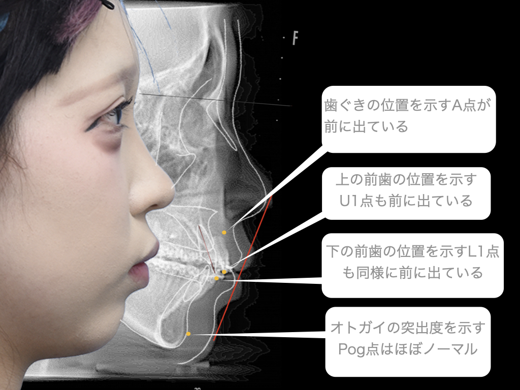 セファログラムによる分析では、上の歯と歯ぐきの位置(A点とU1点)が約4ミリ、また下の歯の先端(L1点)が約3ミリ前に出ていました。アゴ先(Pog点)の位置は思うほど悪くなく、歯茎と歯が出ていることから後退して見えることがわかりました。